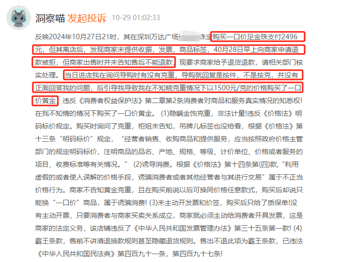 无独有偶,广东深圳的黄女士曾在某珠宝店购买足金珠,总共花费2496元,离店后发现商家未提供收据、发票和商品标签,向商家申请退款时被告知售后不能退款。黄女士还表示,当日进店曾询问导购有没有克重,导购只回复是按件,不是按克,并没有正面回答问题,随后便诱导自己在不知晓克重的情况下以1500元/克的价格购买了“一口价”黄金。目前该投诉已得到圆满解决。